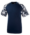 100% polyester • 3.5 oz. • moisture management/antimicrobial performance fabric • self-fabric collar • sublimated camo shoulder panels and sleeves • double-needle bottom hem • heat seal logo on left sleeve • Sizes: XS-4XL